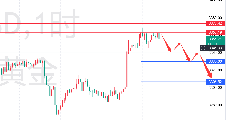 具体操作思路:有参考上周五的3363做空的可看3345位置能否下破;空仓的可等待3363附近再去布空看跌,保护3374,目标下看3345附近;短线方面是建议在45附近止盈 ,有破位动作后等待金价反弹3352附近再介入空单下看,中线可减半仓看持续看金价向下运行是否能到3330位置后去看阶梯目标。
